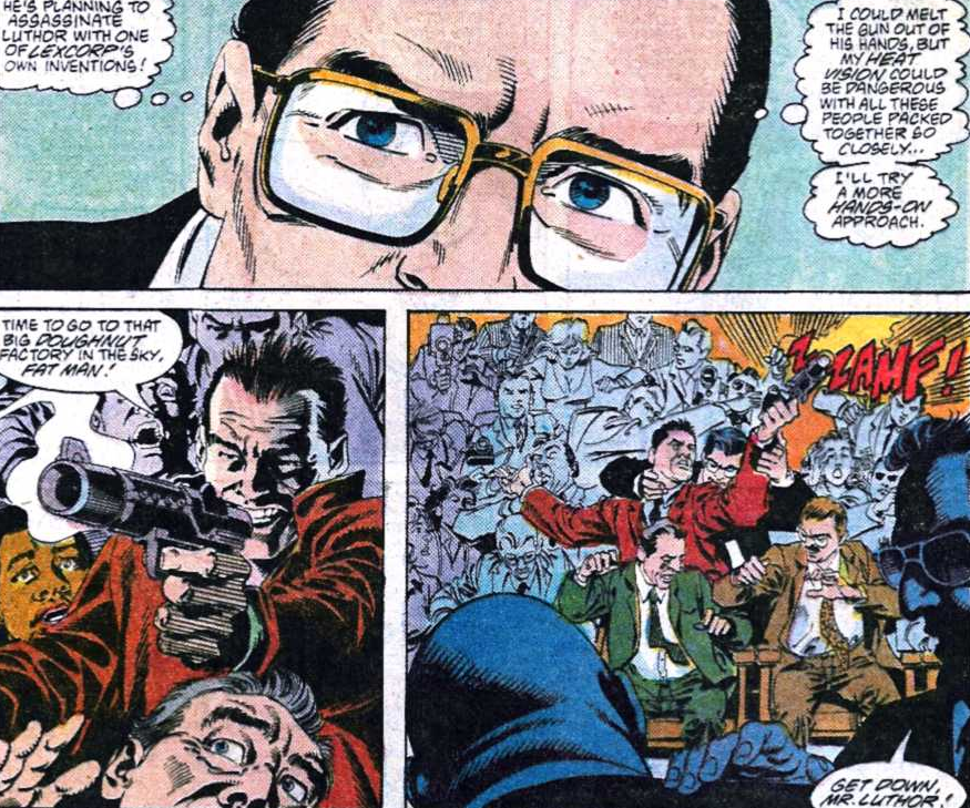 Long answer: In Adventures #447, a hitman hired by Morgan Edge tries to send Lex Luthor to “that big doughnut factory in the sky” during a press conference, but luckily Metropolis’ foremost X-Ray vision-having reporter happens to be in the crowd and prevents it.