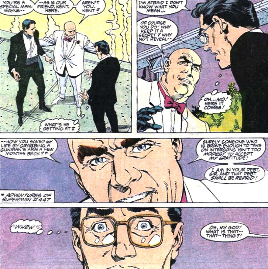 This incident isn’t mentioned again until 20 issues later, in Adventures #467. (UPDATE: Yes it is. Again, see below.) Clark, Lois, and out-of-towner Bruce Wayne are attending the “LexCorp Zenith Award for Journalism” (a.k.a., the in-universe Baldy Awards) when Lex corners Clark and tells him to reveal his secret: the fact that He Saved Luthor’s Brain from being shot. Clark is very relieved that that’s the secret he’s talking about.