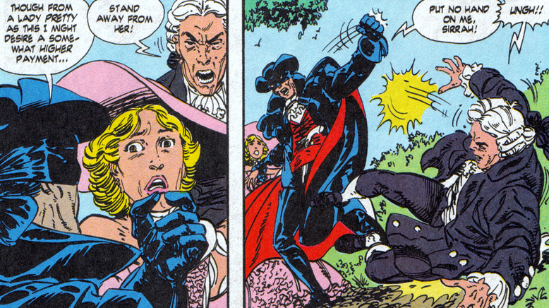 JOHN BYRNE IS BACK! Mid-'90s Byrne, but still! This Elseworlds tale is set in a timeline in which Krypton exploded centuries earlier than it was supposed to and its last survivor wasn't a baby in a pod but a grown-ass adult called Gar-El (which is far too close to “Garfield” for my comfort). Gar crashes down somewhere in England in 1768, right in time to stop a notorious masked thief/horndog known as “The Raven” from having his way with a posh lady right in front of her husband. Yes, we are on page 4 and there's already been an attempted sex crime. This is a Byrne comic, alright.