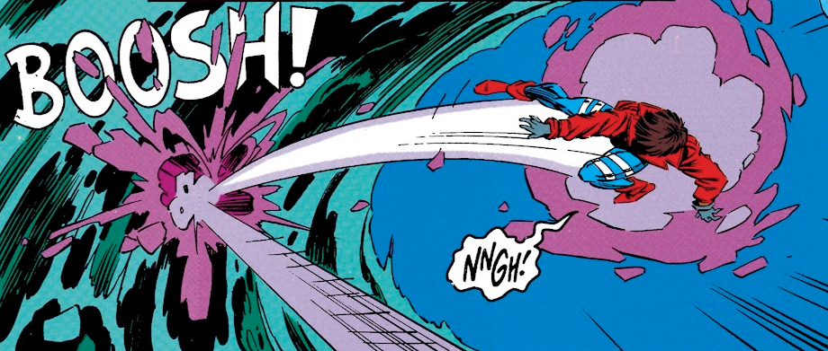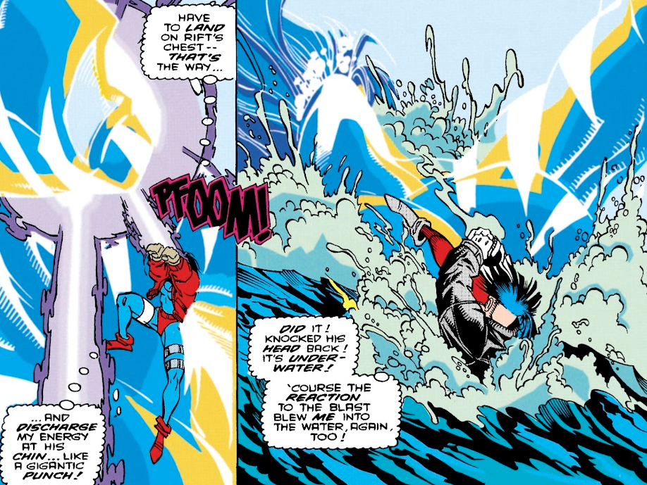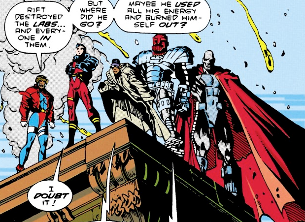 By the way, while all the heroes fight Rift, there’s a coloring error that suddenly turns Rocket into Superboy – further evidence that Superboy’s Milestone Universe counterpart is a pregnant girl.