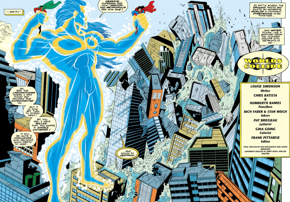 Rift announces that now that he’s merged the cities, he’s gonna sort out the “continuity problems” by getting rid of all the redundant elements, like the two evil labs/sleep clinics where he was experimented on when he was a regular mailman. The heroes don’t want Rift to destroy the lab because it contains the weapon Steel and Hardware created to depower him, so they join forces to distract him while Superman, Icon, and Hazard go retrieve the anti-Rift device.