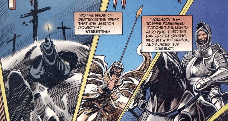 President Clinton has tasked a guy named Professor Hazzard (another coincidence! Worlds ARE Colliding!) with finding a way to kill the Spectre if that ever becomes necessary. Hazzard travels into the Dreaming (read: takes a nap) and, with Lucien’s help, learns about the Spear of Destiny: a spear that once struck Jesus, which eventually ended up in Hitler’s hands and was used to keep all of the Justice Society, including the Spectre, out of Germany during World War II.