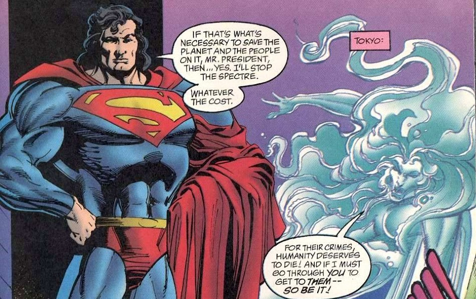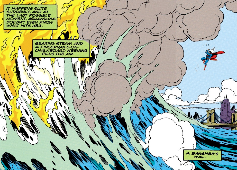 Superman is part of a truly random assortment of DC characters appearing in this issue, including most of the Justice Society, Lucien from Sandman, Nightshade from Suicide Squad, and Naiad from Firestorm (who, coincidentally, is also a lady made of water, like Aquamaria). Oh, and Adolf Hitler and Bill Clinton appear too. Jesus, who isn’t in this issue? Not Jesus, he’s also in here. Seriously!