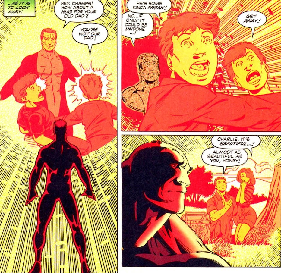 After helping the Outsiders break out of jail, the Eradicator joins them on a trip to “the underworld nation of Abyssia” to look for their teammate Looker, who has been turned into a vampire by the Dracula wannabe ruling that place. While down there, everyone suddenly starts experiencing visions related to tragic moments in their lives. In the Eradicator’s case, he remembers he had two kids as Dr. David Connors and sees them calling him a freak.