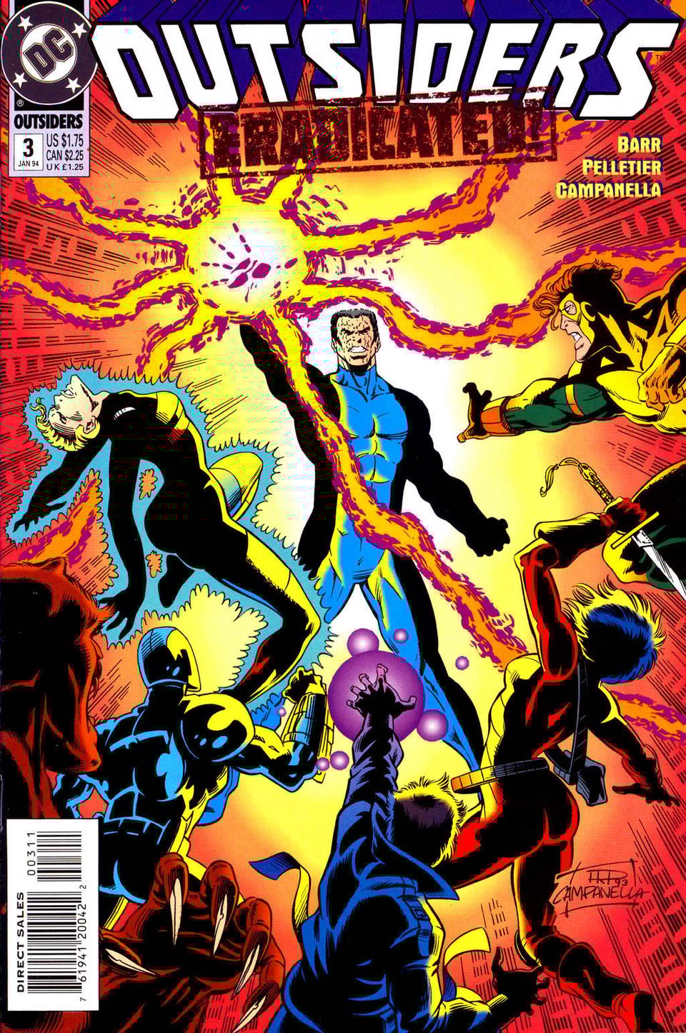As mentioned during the new Eradicator's introductory issue in Action #693, the Outsiders, Batman's old B-team, have been framed for the murder of an entire village in Europe. The Eradicator for some reason decides it's his job to avenge those people so he tracks down the Outsiders and starts fighting them. It... doesn't go well for the Outsiders.
