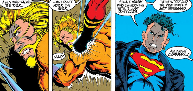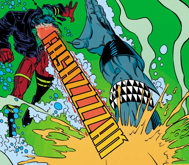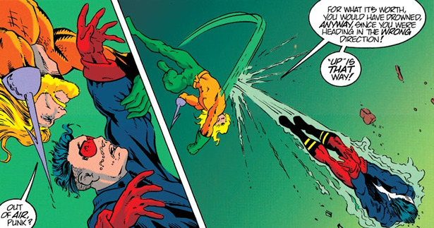Aquaman says "I'll be back," but Superboy doesn't look very intimidated (yes, of course he does Terminator joke). As it turns out, he should have been, because Aquaman returns with a shit-ton of whales and floods the entire base with the resulting tsunami, causing Superboy to almost drown to death for the second time this month.