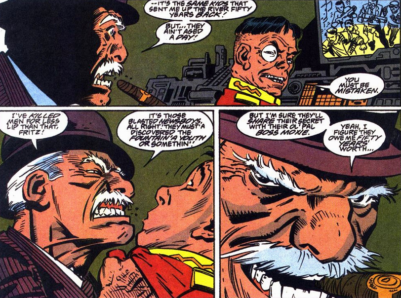 The Newsboy clones find out about this and break into the orphanage, where Moxie recognizes them and, instead of instantly dying of a heart attack, figures they owe him the secret for how they're still young.