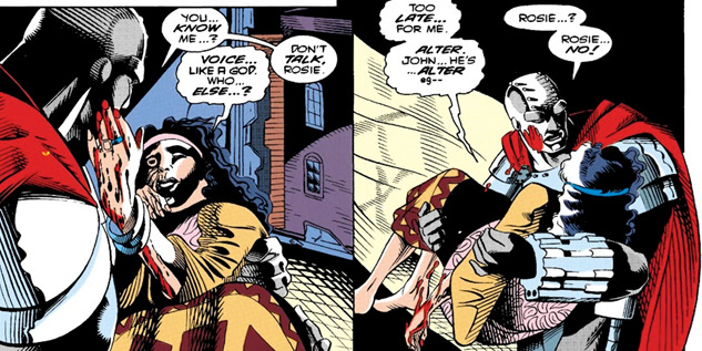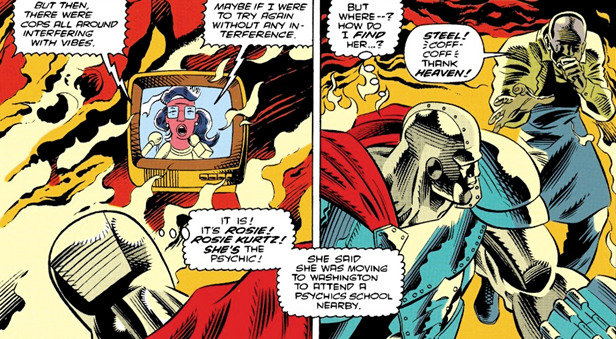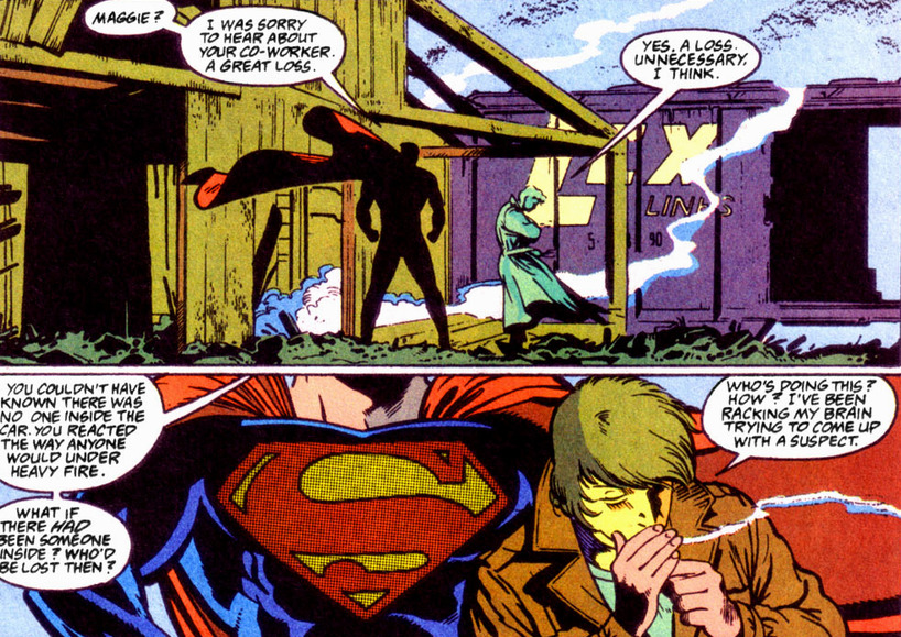 There's a serial killer on the loose in Washington, and his victims look like they were hit with a sledgehammer. As the state's foremost sledgehammer user, Steel is a suspect, especially according to a particularly belligerent detective who almost seems like he's trying to divert attention from something. Hmmmm. Anyway, the other cops are so desperate to find the serial killer that they hire a psychic: Steel's friend from all the way back in Man of Steel #22, Rosie.