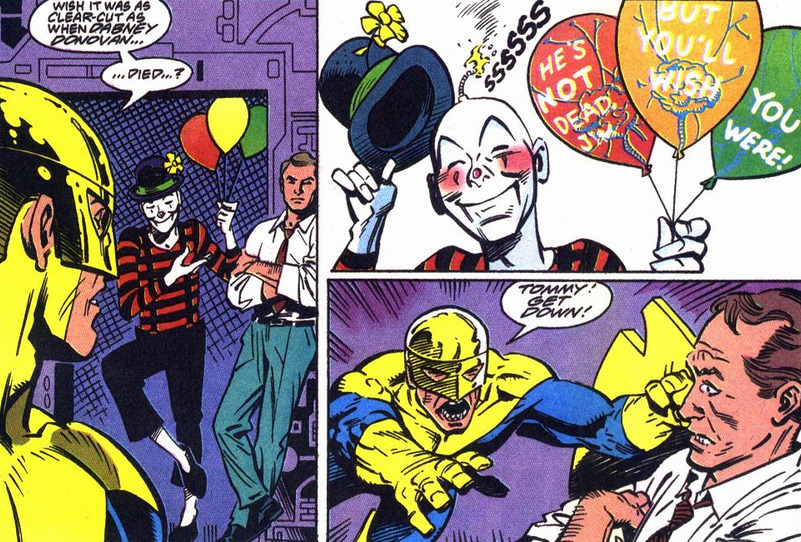 The final pages of this issue pick up on another long-running storyline: ever since their first appearance in Superman Annual #2 (1988), everyone at Cadmus has believed that their insane founder, Dabney Donovan, is dead, even though he's been secretly running around behind the scenes pulling crazy schemes, like when he saved Luthor's brain or murdered Cadmus' Director Westfield. Now, he finally presents himself to the Guardian and the Cadmus bosses, but only to kidnap them via a "Mime-Bomb" (exactly what it sounds like) and... take them to the circus. We'll find out what the hell that means next issue.