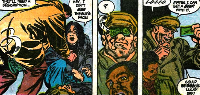 And finally, the Ultimate Jose Delgado Misadventure! Jose is feeling crappy that his girlfriend, Cat Grant, is a TV star while he’s an unemployed schmuck, so he buys a lottery ticket to see if his luck improves (I think it’s the same lotto store Barrage hit up a couple of issues ago). Then good ol’ Jose stops to help those hoodlums who got schooled by Mr. Z, and this happens: