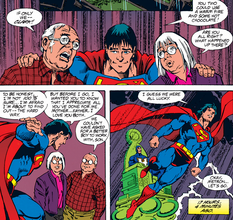 Metron of the New Gods comes to remind the grieving Superman that all the other superheroes are waiting for him at Zero Hour #3 (now on sale!), but Superman says they can wait a little longer because he has something important to do: hug his Earth parents and tell them he loves them.