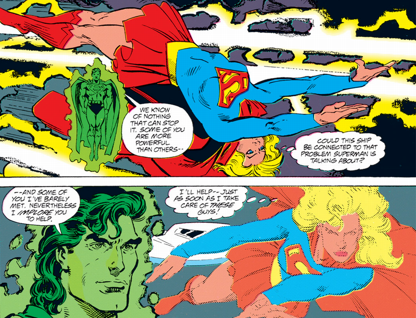 We start with Supergirl fighting some 68th century aliens who found themselves transported to present-day Earth and apparently figured they might as well invade it. Superman drops by and deals with the aliens via his usual approach to problem-solving: he just chucks their ship back into space.