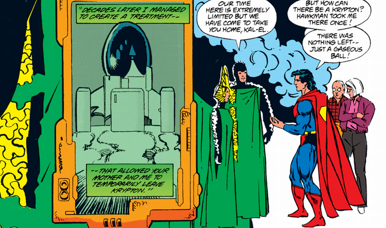 So, Superman flies to Smallville to check on his parents, only to find two surprise characters in their home: freaking’ Psi-Phon and Dreadnaught. Wait, no, it’s his other parents, Jor-El and Lara, just standing in the Kent’s kitchen. Jor-El explains that, after sending little baby Kal-El’s rocket to Earth all those years ago, they realized Krypton wasn’t exploding after all, whoops. A scientist called Jen-Em had figured out how to stall the explosion, and then, after years of work, they managed to cure Krypton of its explosive tendencies for good.
