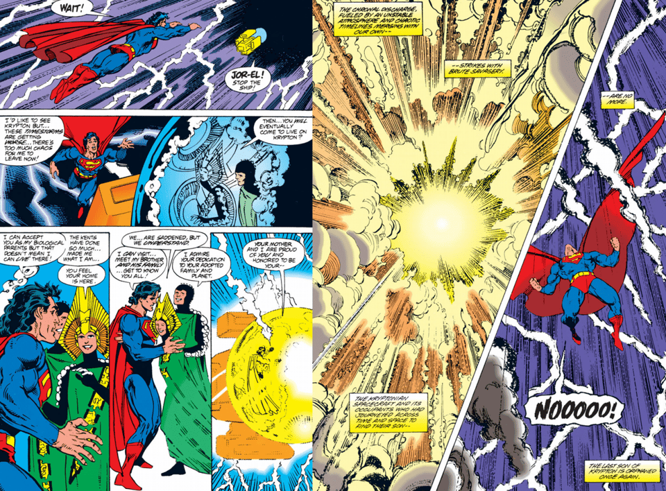 Superman agonizes over the choice for a moment, but then he’s like “hey, wait a minute, I can just go visit!” He informs the Els of his decision and they’re overjoyed – until a poorly-timed thunderbolt full of chronal energy strikes their spaceship and erases them from reality.