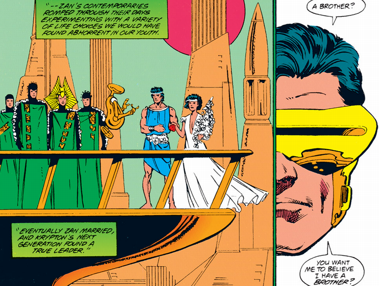 Through the futuristic Viewmaster, Superman learns that in this timeline, Krypton’s near-death experience caused the Kryptonians to re-evaluate their priorities and abandon their cold, emotionless ways (hence this Lara not being repulsed by her son). In fact, Lara became the first modern Kryptonian to get pregnant and have a child the old fashioned way – meaning that, yes, Superman has a brother, Zan-El. Zan not only grew up to become “prefect over the entire planet” (so, world president) but, more importantly, he also brought back the shorter togas and fashionable headbands of Krypton’s ancient, Mike Mignola-designed past.
