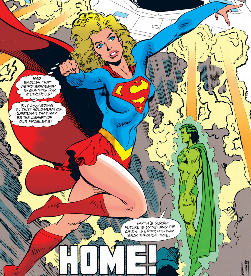 At the start of the issue, as she fights the aliens, Supergirl sees the Superman hologram that he and Metron created with Green Lantern’s help in Zero Hour #4. We’ll go over every DC comic that got spammed with green holo-Superman in another post.