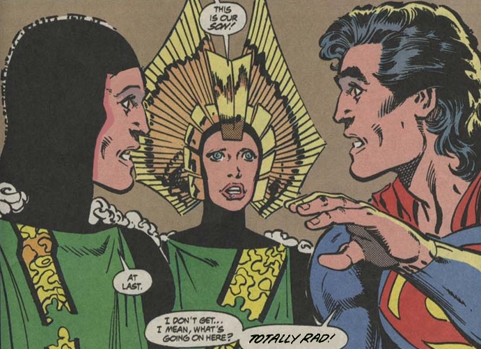 ZERO HOUR CROSSOVER! Due to the time-related shenanigans going on around the DC Universe, Superman meets his Kryptonian parents again – and this time, his mom doesn’t want to puke when she sees him! In fact, she even gives him a motherly kiss. Aww.