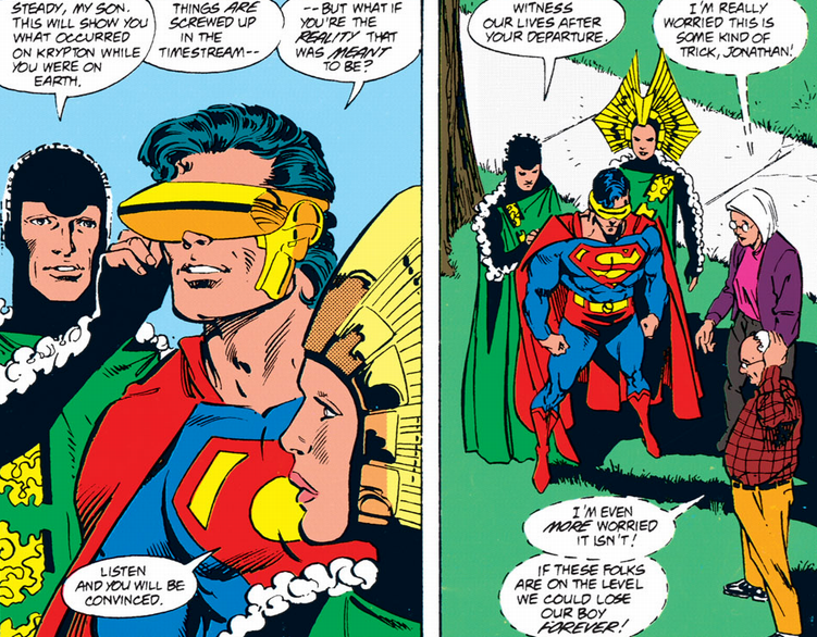 Superman quickly figures out that this must be the result of the weirdness caused by Zero Hour (after all, he’s been to Krypton and saw that there’s nothing but a big ball of green gas there), but he agrees to put on a Cyclops-esque visor that will show him Jor-El’s story in more detail.