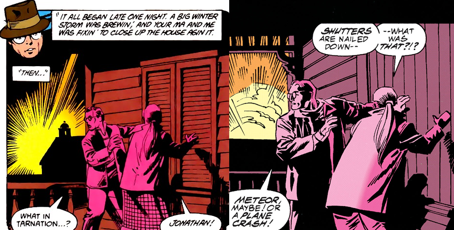 On the other hand, I’m pleased that the freak storm that trapped the Kents in their farm for months, conveniently giving them an excuse for suddenly showing up with a baby, is still part of the continuity (and presumably still orchestrated by Manhunter robots, as revealed in the Millennium crossover). Hey, wait a minute, shouldn’t Clark’s official birthday be months after Kenny Braverman’s, then? Did Kenny let Clark celebrate their birthday together because “no one knew” the exact date for Clark’s, due to the storm? Such a good friend.