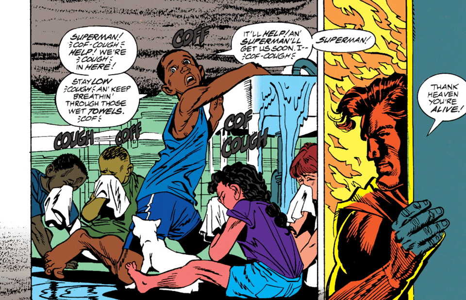 The rim-lit Superman is a great, simple panel, and a part of a great sequence—does it get more Superman than rescuing orphans? Though Keith should get a shoutout for his quick thinking of dousing everyone in water to keep them safe until help arrived.