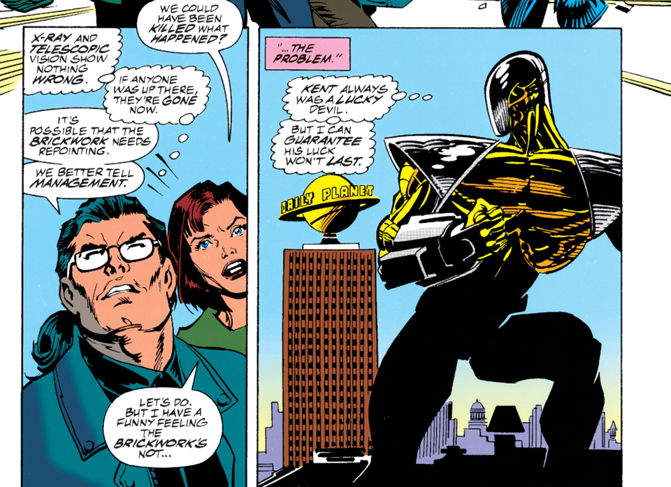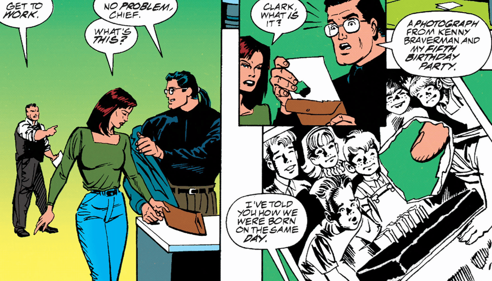 As Lois and Clark deign themselves to get to work at the rebuilt Daily Planet offices, they see that someone left Clark an envelope containing a photo of his fifth shared birthday with little Kenny Braverman (you know, the pickup truck baby), but little Clarkie’s face has been cut off. Clark thinks it’s “probably nothing” – but, right on the next page, some debris happens to fall on them as they’re walking outside the Planet and would have crushed them if it wasn’t for Clark’s quick reflexes.