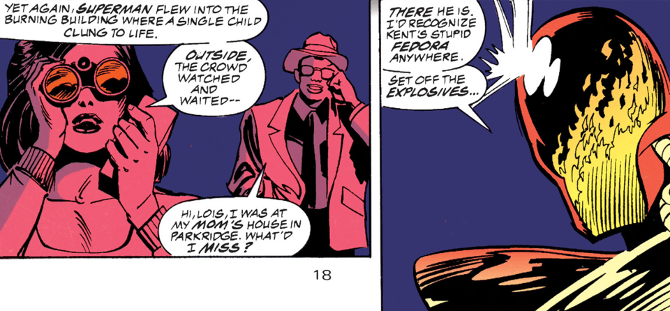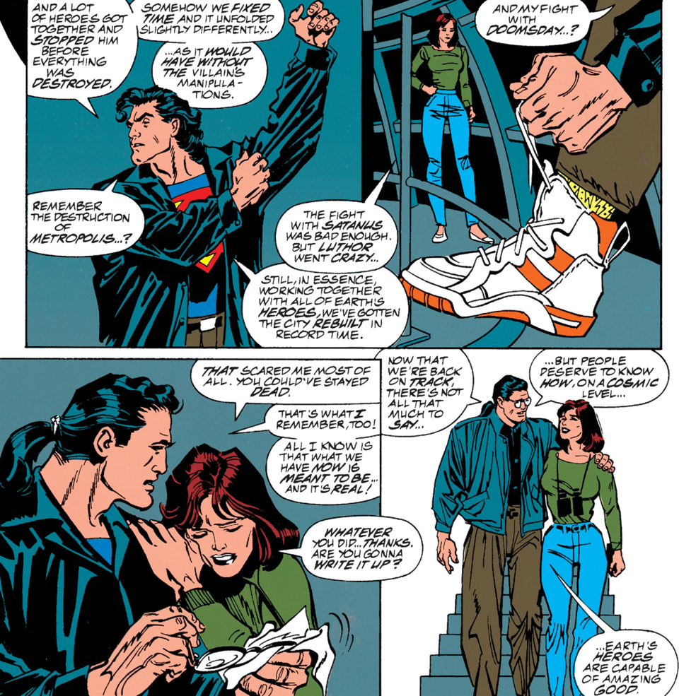 I’m not totally sure why Lois mentions a “fight with Satanus” when Clark asks if she remembers Metropolis’ destruction. Is she talking about the “Blaze/Satanus War” storyline? I do remember a building getting turned into a portal to Hell there, but the level of destruction was still way lower than in other storylines like “Panic in the Sky!” or, you know, “Doomsday!” (if it has an exclamation mark at the end, you know Metropolis is getting fucked up).