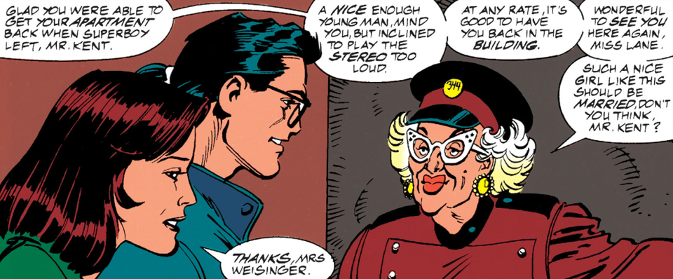 I presume Mrs. Weisinger is based off of Thelma Weisinger, lifelong wife of famed DC Comics editor Mort? I can’t find much in the way of photos of Thelma (her eyewear actually remind me of Bob Kane’s wife Elizabeth Sanders, who played Gossip Gertie in the Schumacher Batman films, one of the more harmless indulgences of those films) but that’s my guess. I don’t remember her featuring too prominently in upcoming stories, but we’ve established I have a fuzzy memory for certain things. [Max: Mrs. Weisinger pushing Lois and Clark to get married already is appropriate, since the real Mr. Weisinger was one of the few creators who, according to a ‘70s poll, was actually okay with that happening and predicted the engagement/wedding pretty much as it unfolded in the '90s.]