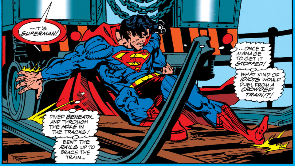 Page 5 we get an absolute jaw-dropper of a splash page, with Superman diving through the skies backed by a postcard worthy view of Metropolis. There’s certain iconic images of Superman that always hold a lot of power (the shirt opening reveal, the chain snap, the bullet bounce, etc—what are some of your favourites?) and Superman stopping a train is up there as a candidate. Bogdanove brings great gesture and a sense of effort as he halts the train before it hits the damaged part of the track. [Max: This panel reminds me of Frank Miller’s cover for Superman: The Secret Years #3, which I only know about because it was also a pinup somewhere.]