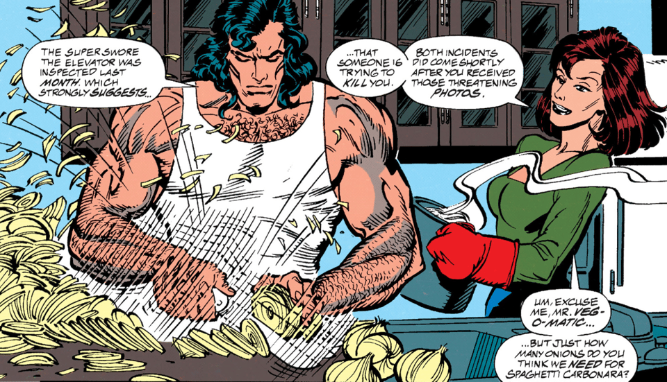 There’s something domestically intimate about Superman chopping a mountain of onions, and I like the distant concentration on his face as he does so. I do wonder if carbonara was meant to be Bolognese, as a traditional carbonara contains no onions. Or was that the point Lois was making, that zero onions are needed for their meal? At any rate, my spaghetti Bolognese contains two full onions, for the record. Maybe we’ll give the FULL recipe to foodie patreon subscribers, ha ha. [Max: You heard him! Join today!]