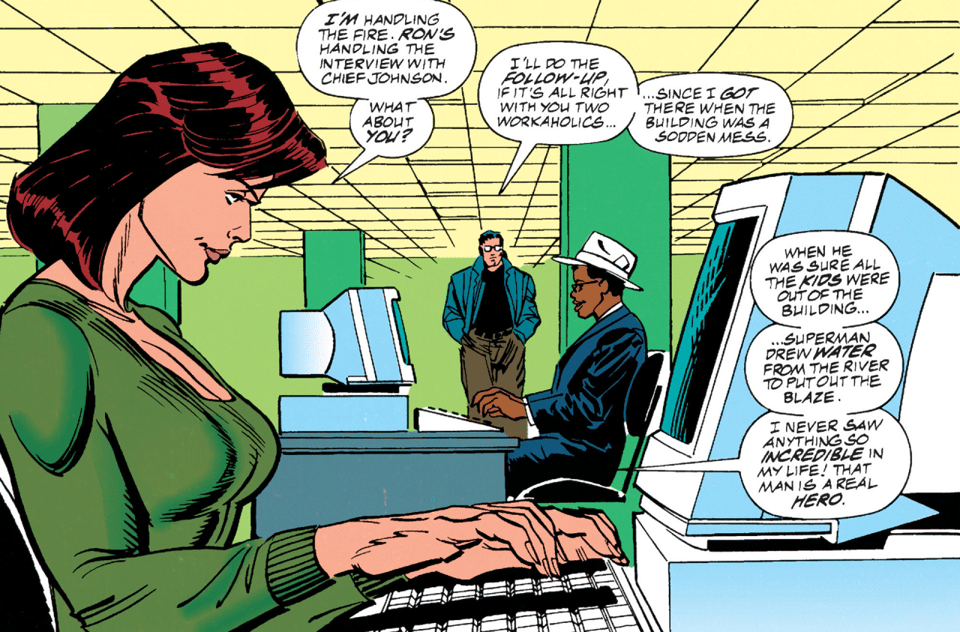 I can’t let how good Lois looks as she types up the arson story pass without comment, so here’s me commenting: she looks great.