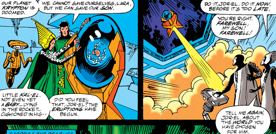 A significant (to me) retcon in this issue is that Jor-El and Lara no longer say the Kryptonian Death Chant right before getting blown to krypto-pieces, as established during the “Exile in Space” and reaffirmed in the Eradicator saga. That’s a shame; I liked that morbid little bit of Kryptonian culture.