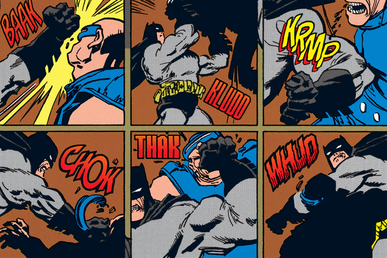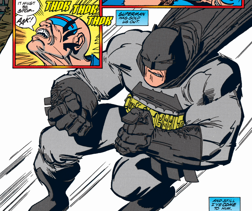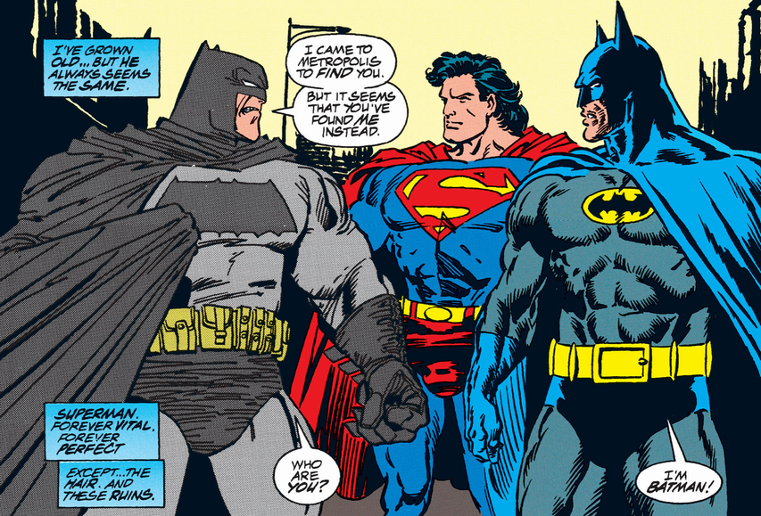 I like that the Dark Knight version of Batman also includes his wry commentary, about the sounds of violence drawing Superman, and the slight diss that the mullet has impaired Superman’s perfection.