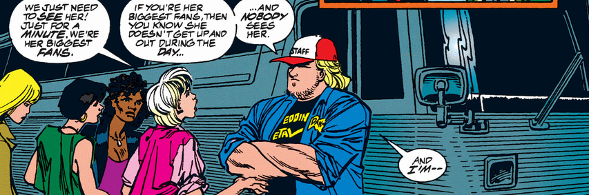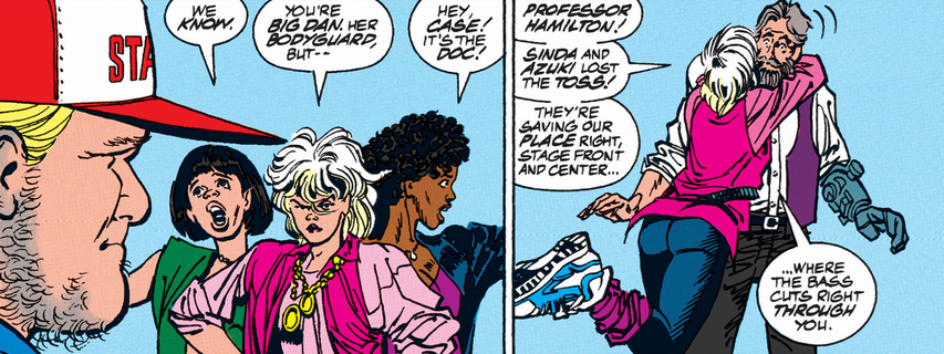Though “Big Dan” bears a striking resemblance to Farley’s security guard character from Black Sheep that movie wouldn’t come out for another two years or so, and the character design doesn’t look enough like Farley’s security character from Wayne’s World 2, so maybe it’s just a generic roadie character. I do love Professor Hamilton’s awkward, hands-off reaction to Case laying a big old, 20-years-his-junior hug on him.
