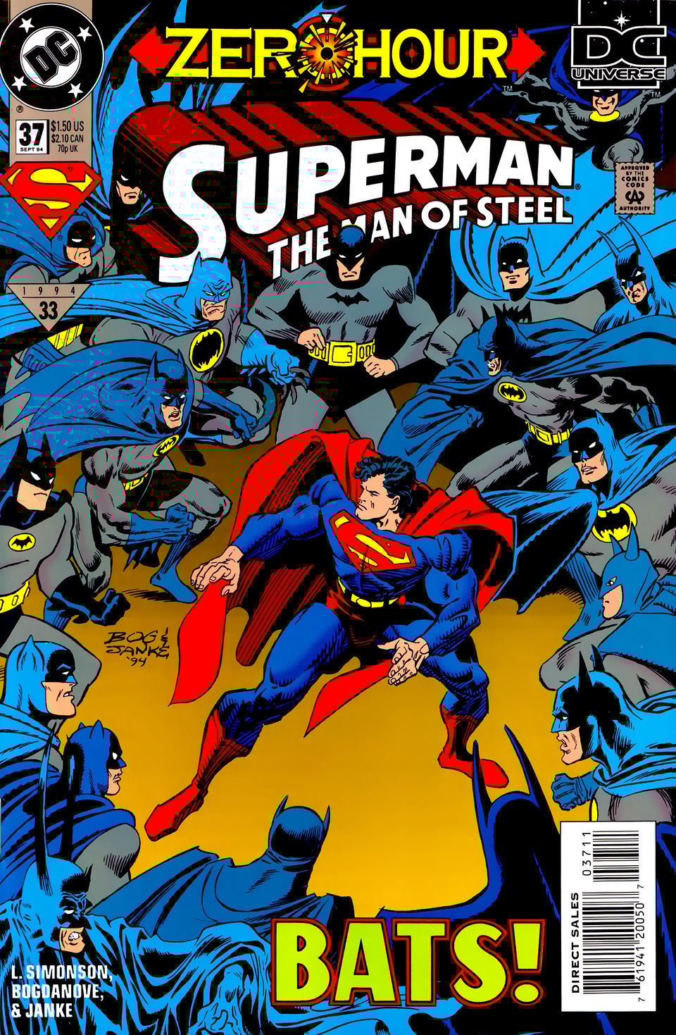Zero Hour is here, and so is Batman! And Batman, and Batman, and Batman, and, yes, even Batman! Clark Kent and Lois Lane are strolling down beautiful, half-destroyed Metropolis when Clark sees a Morse code message coming from a rooftop. It turns out to be Batman, who's looking rather... Neal Adams-ish. Superman should have realized something was off when Batman called him "old friend," even though these two have only been able to stand each other for (in DCU time) about a year at most.