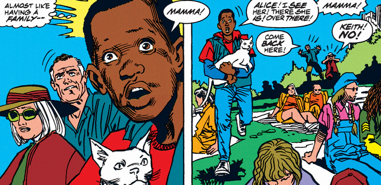 Keith the Unlucky Orphan attends the concert with his new friend Alice White and her husband, Perry, but Keith wanders off when he thinks he sees his long-gone mom in the crowd. That's the last we see of Keith in this issue, so it's easy to get the impression that he got ran over by the tank or something. (At least we learn that Lucan, that other kid from last issue, did find his mom.)