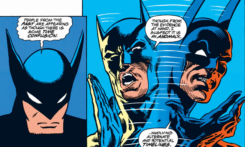 After saving Jeb, this Batman runs into Superman and says he came to warn him about the time anomalies, but it's pretty obvious he already knew about them, considering he's hanging out with two separate Batmen and all. The Batmen barely have any time to get acquainted before a third Batman drops by, this one looking like he came straight from 1939's Detective Comics #27. Oh, and then the Neal Adams Batman suddenly turns into a different, much more pointy-eared Batman in the middle of a sentence.