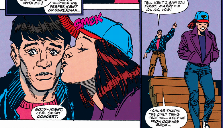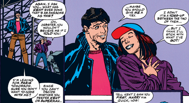 At the end of the issue, Jeb confirms his scumbag status by bragging to Lois that Clark has never done anything as "awesome" as organizing a concert with extremely lax security, and then trying to get Lois to come to Paris with him. Lois is surprisingly patient with him and even gives him a kiss on the cheek. He urges her to get married quick because "that's the only thing that will keep me from coming back," which is the best argument for the Clark/Lois marriage I've seen.