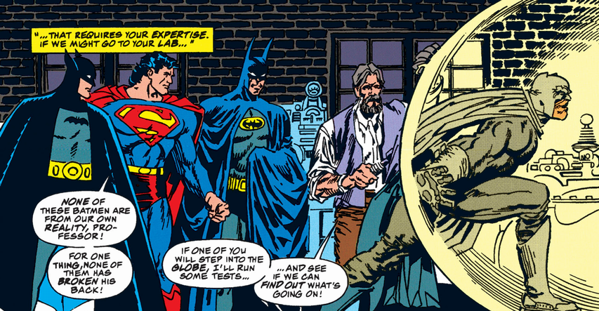 Hamilton's instruments determine that "something very odd is happening to time," which Superman probably could have figured out without the need of a big glass ball -- especially since the Batmen are now rapidly turning into other Batmen and fading out of existence. Hamilton's conclusion is that Superman should probably look up the real Batman from this timeline. Just then, Superman hears a high-pitched noise: it's that precise Batman, who just arrived in Metropolis and used a gizmo to call his attention.