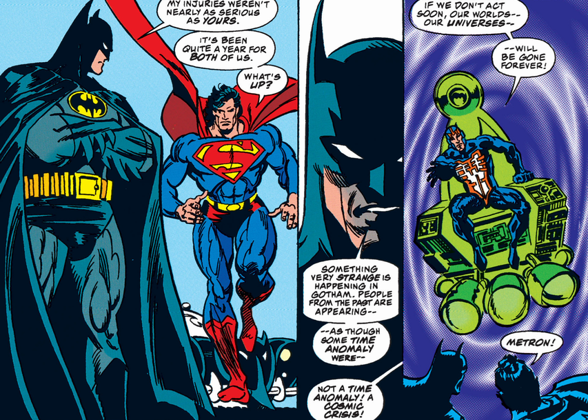 '90s Batman says the same thing as the others: weird time-related things are happening in Gotham... and Metropolis too, as is pretty clear by now. Just then, Metron of the New Gods shows up in his funky time-and-space-traveling chair to say that this isn't a mere "time anomaly" -- it's a CRISIS™!