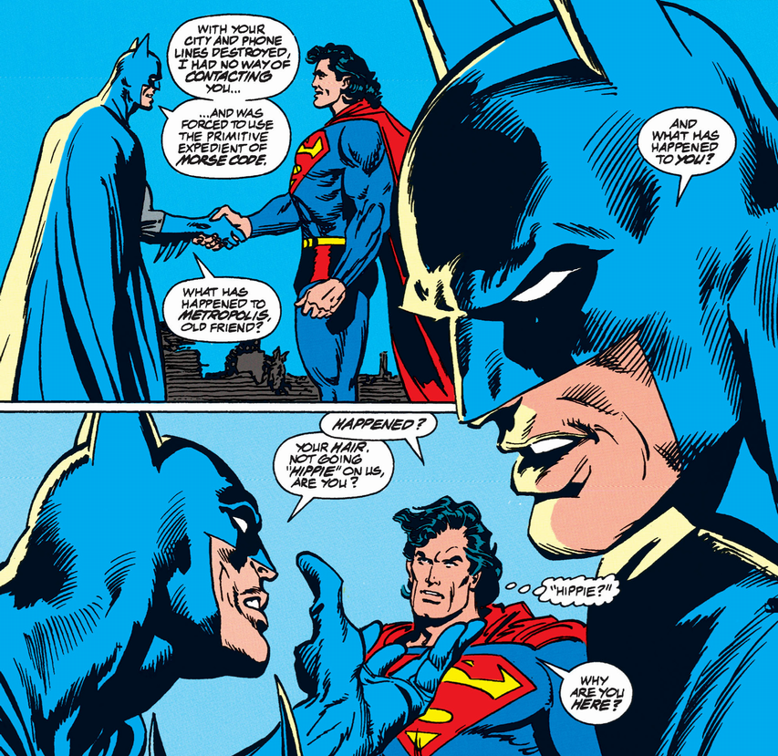 Not only does Batman not recognize Superman's post-resurrection mullet hippie hair, but he seems confused when Superman mentions that little incident where he had his back broken by a 'roided-out wrestler, which suggests that he hasn't experienced the '90s at all. If Superman was truly Batman's friend, he'd rush him to the nearest arcade to play Super Street Fighter II Turbo right away.