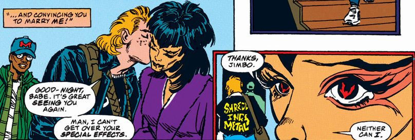 It's obscured by the big glass ball in the panel up there, but Professor Hamilton debuts his hydraulic robot arm in this issue, having lost his flesh and blood one in Adventures #514. Incidentally, the "girlfriends" of Hamilton's I mentioned before are Case, the white-haired girl he met in that Adventures issue, and her Riot Grrrl bandmates, who invite Ham to sit with them near the stage. I'm surprised he didn't lose his other arm in the mosh pits.