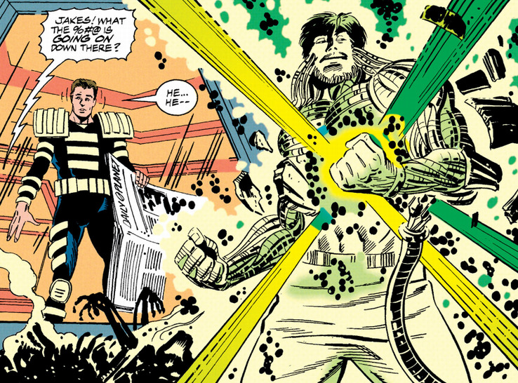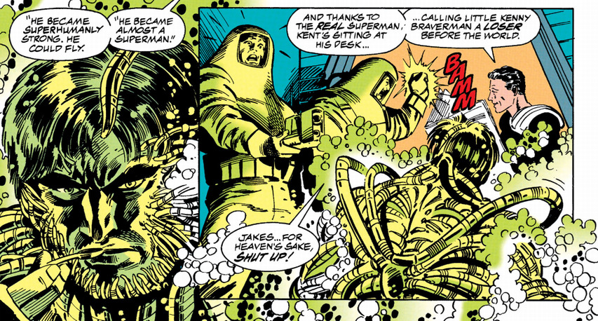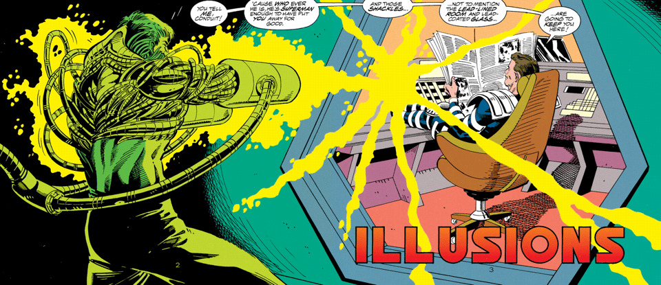 It’s entirely possible that I wasn’t paying attention in earlier issues, but Clark Kent’s article (read tauntingly by Conduit’s jailers) details that Conduit’s “radiation spouting cables grew from his body”—was that made clear previously? [Max: Nope, in fact I got the impression from previous issues that he got the cables from the CIA experiment, though it’d make sense if that bit of info was classified.]