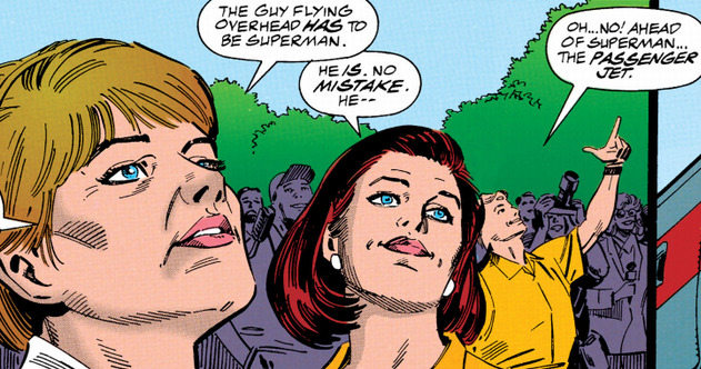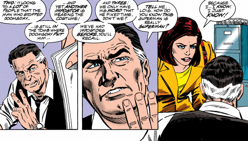PREVIOUSLY: A fight between Superman and his childhood friend/adulthood enemy Conduit broke open Superman's former tomb, revealing a familiar-looking corpse inside. Now many people are wondering if the corpse is the real Superman, who never came back to life after his run-in with Doomsday, and the long-haired dude we've been following over the past year is another impostor, like the one who turned out to be an evil cyborg. Among those doubters is Perry White, who raises some reasonable points, but Lois offers a compelling counter-argument: