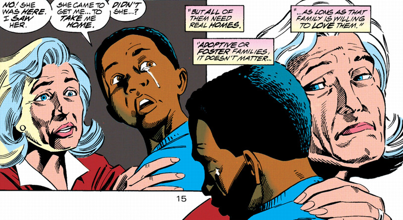 A few pages are devoted to Man of Steel's current co-star, Superman's Boss's Wife, Alice White. Alice is currently volunteering at the orphanage where Keith the Unlucky Orphan lives -- I mean, lived, since the orphanage burned down during a Conduit attack last issue. Now the kids are staying at a creepy shelter, where Keith has a bit of a meltdown when he thinks he saw his long-missing mom. If only there was a loving older woman around who could adopt him!