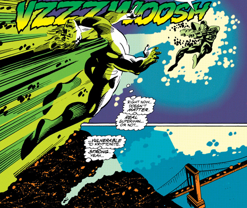 Upon being hit by the weakened Superman, Conduit says "That it? I been hit by the best, impostor -- and, fella, that ain't you!" As a kid, that always confused me, and not just because of the excessive italics (it's the '90s, everyone talks like that). I thought Conduit was saying he's been hit by the "real" (pre-Doomsday) Superman, but I couldn't figure out when that could have happened. Now I'm guessing he's just saying he's been hit by other super-strong people and this latest punch doesn't compare. Presumably he's fought other superheroes while running Pipeline, but the fights weren't interesting enough to be included in their comics.