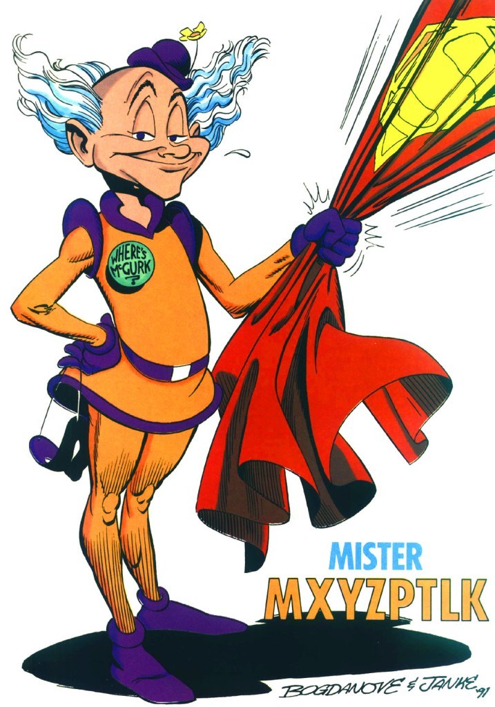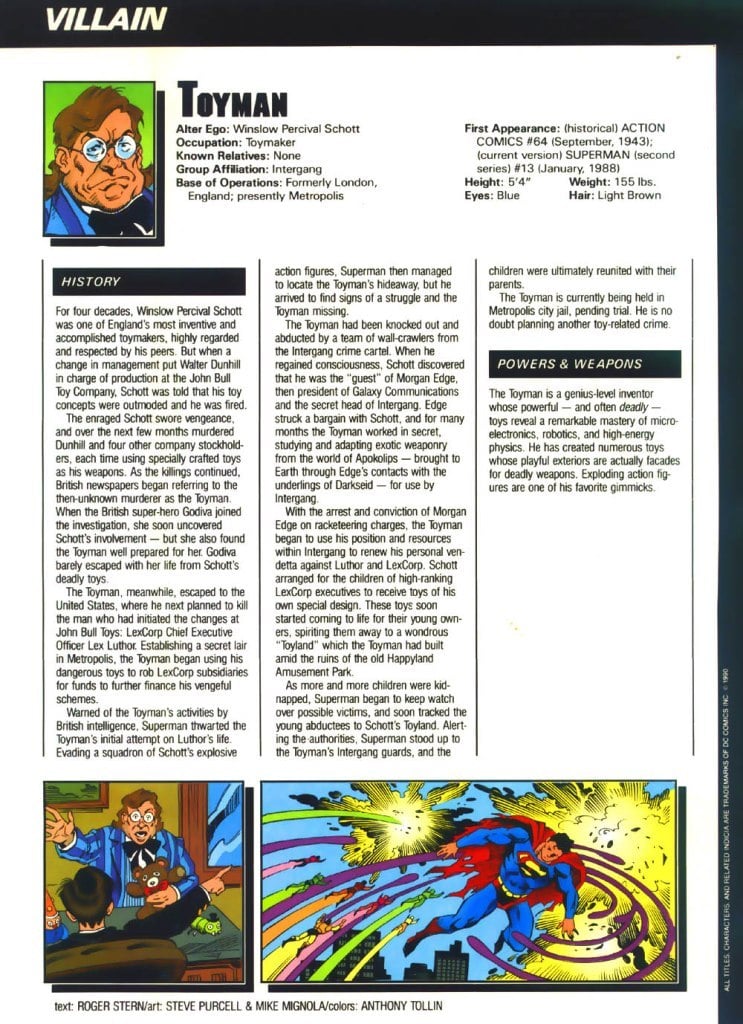 “Ridiculous villains” edition! Featuring Toyman (who torments Superman with deadly toys), the Prankster (a.k.a. Joker-lite), and the “distinctly handsome” Mr. Mxyzptlk (a being of infinite powers who uses them in whimsical ways). It’s interesting to me that the Mxy profile is drawn by Jon Bogdanove, six years or so before he became the character’s definitive artist in the classic “Death of Mr. Mxyzptlk” (Man of Steel #75). Also, that panel where Mxy steals Superman’s pants isn’t from a real issue, but I’m not sure if that’s good or bad.