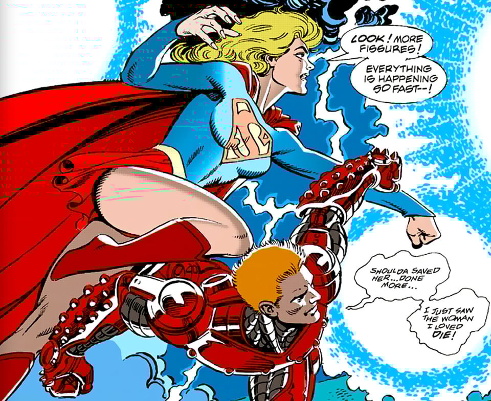 We open with Supergirl, Steel, Alternate Timeline Batgirl, and a distraught Guy Gardner coming out of a big hole in reality in what used to be Coast City. Guy is muttering something about how he “just saw the woman I loved die” (which, if you’re following @greenlantern94to04, you also just saw in the latest post about Guy Gardner: Warrior #24). More of these “entropy fissures” pop up all around and one of them gobbles up Steel, despite Guy’s efforts. It’s been a humbling day for the once obnoxiously arrogant Guyster.