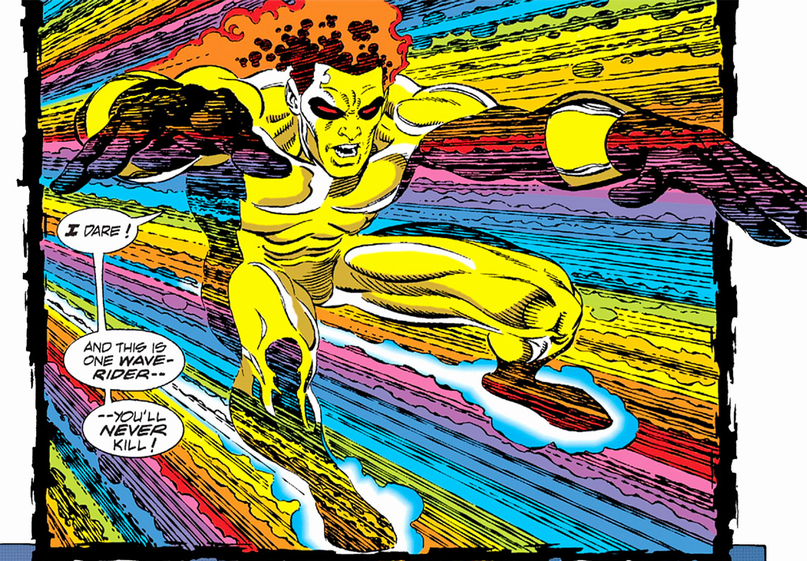 As time gets erased, Metron takes Superman and a few others outside of it: meaning, to Vanishing Point. The heroes need someone who can easily ride the waves of time, so it’s too bad that Waverider died last issue. Luckily, they still have his alternate human version Matthew Ryder, so they just turn him all Waverider-y using convenient comic book science. (It’s kinda funny that no one asks for Matthew’s opinion on this; he’s just like “Oooh, I don’t know about thi– whelp, guess I’m Waverider now!”)