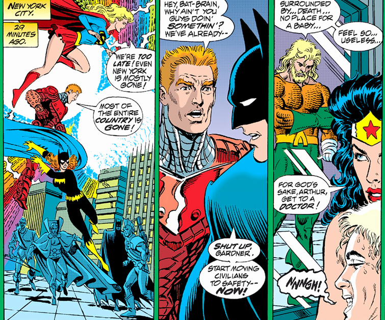 The Steel/Supergirl/Batgirl/Gardner team up came immediately from a needlessly cruel set up by Extant, where they were forced to see the active destruction of Coast City as they chased Extant through time as he toyed with them over in Guy Gardner: Warrior #24. Most tragic of all, Guy temporarily lost his eyebrows in the battle. [Max: NoOoOoOoOoOoO!]