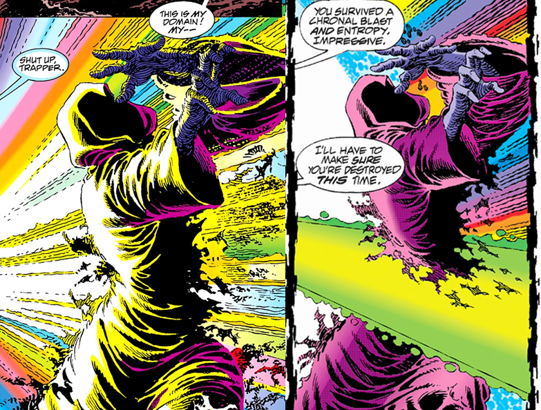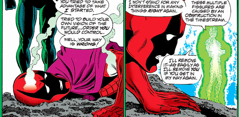 Back in the 20th century, everyone born in the past or future starts disappearing as their eras of origin are deleted from history. That means Impulse (30th century), Booster Gold (25th), and the old folks at the Justice Society (early 20th). Before being wiped out, however, Jay “First And Apparently Only Surviving Flash” Garrick manages to convince his old friend The Spectre that they’ve finally reached the part of the crossover where he decides to get involved. (I only said decides, though; he’ll actually do it next issue.)